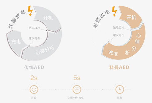 當患者出現心臟驟停時,黃金搶救時間只有4分鐘,分秒必爭。科曼AED在心律分析過程中同步智能預充電縮短了開機和心律分析的時間,開機到充電完成全程不超過7秒,心律分析完成時即刻可以進行放電。